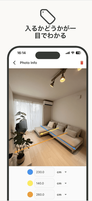 ・写真と寸法をセットで記録することで、買い物時や配置検討時にも即座に確認可能。