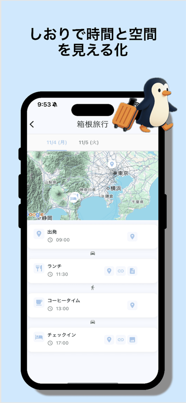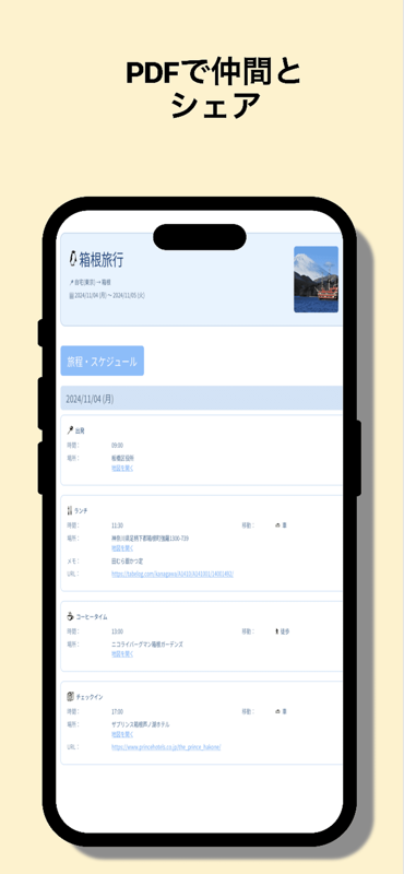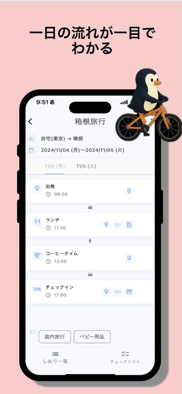 「しおりっぷ」は、旅行の計画をシンプルかつ直感的に管理できるアプリです。出発地・目的地、日程、持ち物リストを1つの画面で確認・編集。旅行がさらに充実します!