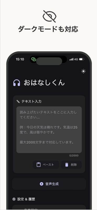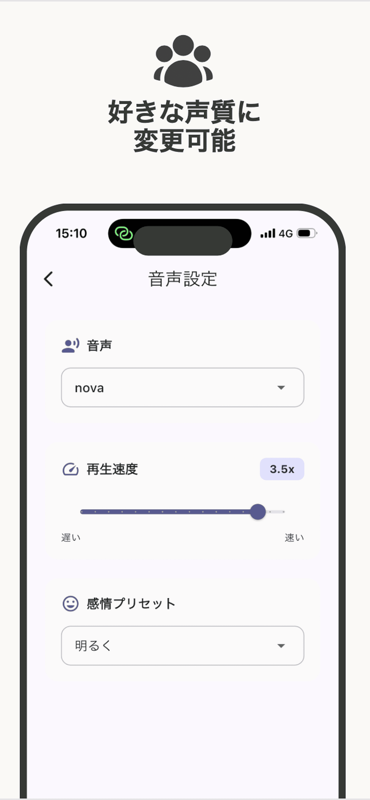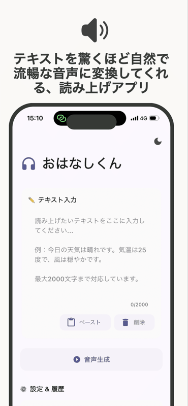 さらに、発声が困難な方や、喉の不調で話せない場面でも、本アプリを使えばあなたの代わりにテキストを“人間のような声”で代読してくれます。